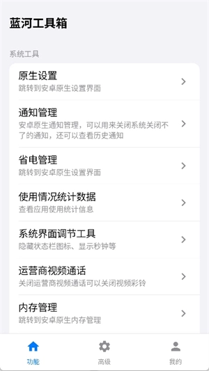 蓝河工具箱是一款集多种实用功能于一体的手机多功能工具箱软件,涵盖系统优化、网络连接管理、电池维护等,能实时监控手机CPU温度,防止因过热导致卡顿;还可检测当前网络信号强度,有效延长电池续航时间,适配多种机型系统。有需求的用户不妨来体验一番!