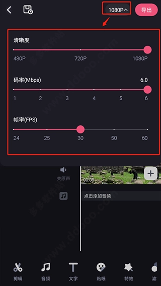 视频清晰度会显示在右上角,点击该区域即可对清晰度、码率、帧率进行自定义设置。