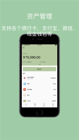 支持各个银行卡、支付宝、微信、现金钱包等资产账户,方便管理统计负债、净资产,轻松知道个人财务情况。