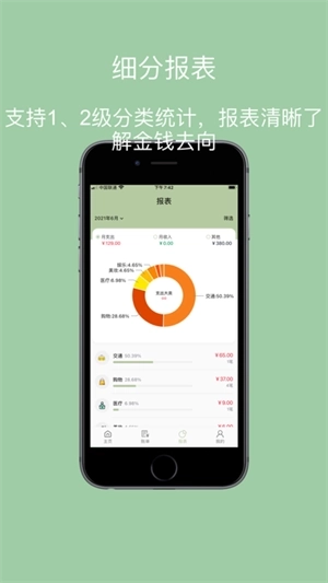 支持1级分类、2级分类各种报表统计,轻松知道钱的去向,及时修正消费习惯。