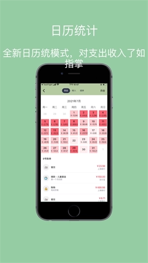 1、页面简洁大方,配色美观,小清新的风格,记账页面一般只显示三天的账单,一进到里就可以看到自己本月的花销和收入结余情况,比较直观。