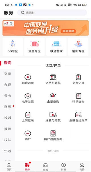 话费充值、联通智家、积分兑换、特色套餐、号卡激活、携号入网、京东服务、5G专区等特色功能板块;