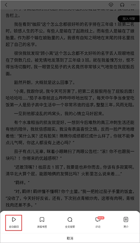 在弹出的菜单里选择“自动翻页”选项,就能开启自动阅读模式了。