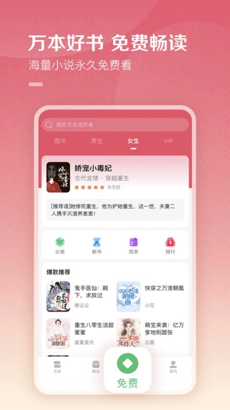 热门分类一应俱全:都市爽文、言情穿越、豪门宠妻、玄幻修仙、青春校园、武侠风云、悬疑推理……全部免费阅读,满足你的追书需求。