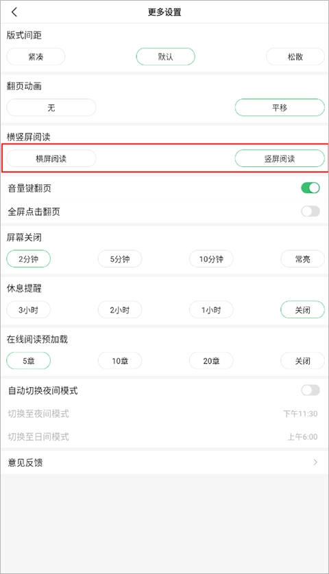 进入设置页面后,找到“横竖屏阅读”选项,选择其中的“横屏阅读”就能完成切换。
