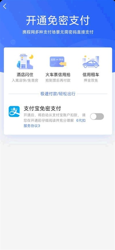 进入后可以看到我们可以开启支付宝免密支付,但需要注意的是:开通后,将自动从支付宝账户扣款,请您在开通前仔细阅读并充分理解《代扣服务协议》。这个功能是否开启需要大家自行考虑,若需要直接点击开关即可开启,关闭操作同理。今天的教程就到这里了。