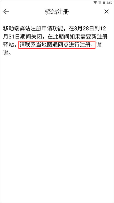 这时页面提示注册申请功能已暂停,可前往当地圆通网点办理注册。