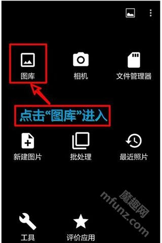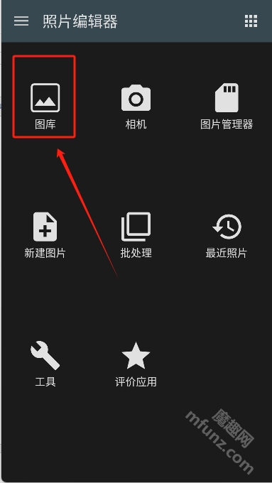 在魔趣网(m.mfunz.com)找到并打开photo editor apk,进入主界面后,点击“图库”选项,以此进入存放着待编辑图片的文件夹。