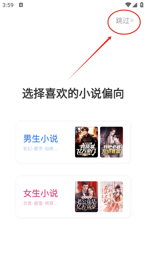 接下来,你可以根据自己阅读小说的偏好进行选择,这样我就能更精准地为你推荐喜欢的作品。要是暂时不想选择,点击右上角的“跳过”按钮就可以了。