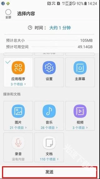在旧设备上挑选需要传输的内容,把想传输的文件勾选好,然后点击【发送】按钮。