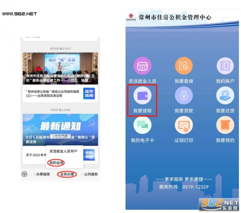 第一步:已签约的公积金缴存者本人登录“常州住房公积金”微信公众号,点击菜单栏中的“业务办理”,接着选择“我的业务”,再点击“我要提取”。
