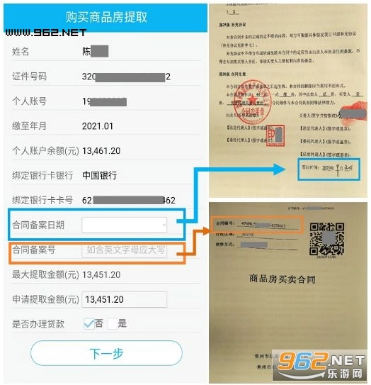 (1)核实银行卡等信息,确认无误后,录入购买本市商品住房的“合同备案日期”“合同备案号”(如图示范)信息