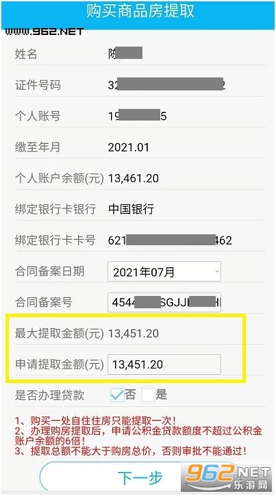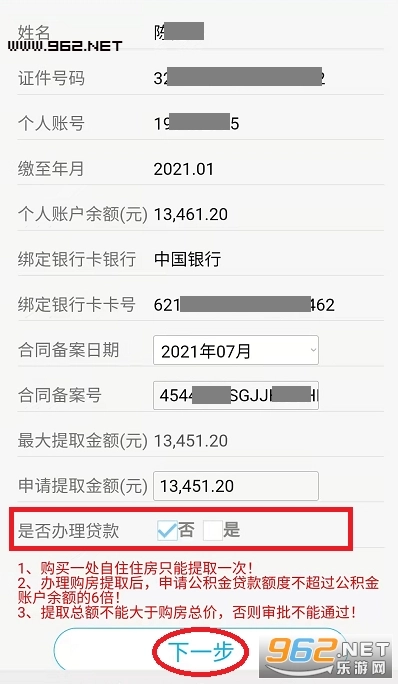 (3)根据自身需求,勾选“是否办理贷款”选项,若需申请公积金贷款的,建议前往我中心服务窗口办理,或在申请公积金贷款时一并办理提取业务。确认无误后,点击“下一步”