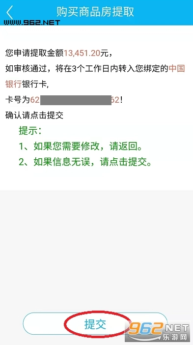 第四步:核对提取金额、银行卡账号信息,确认无误后,点击“提交”