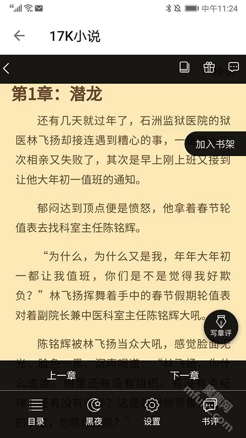 在阅读界面,具备选择章节、设置阅读模式、添加至书架、浏览书评以及撰写章评等功能。