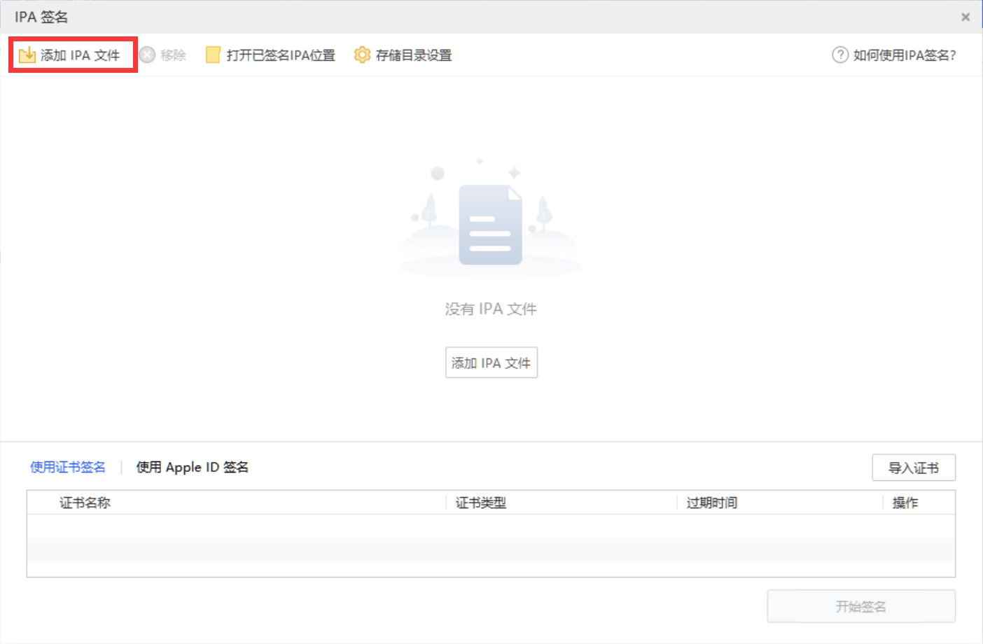 第二步、进入IPA签名页面,点击右上角的“添加IPA文件”按钮,在弹出的选择框中选中待签名的IPA文件。