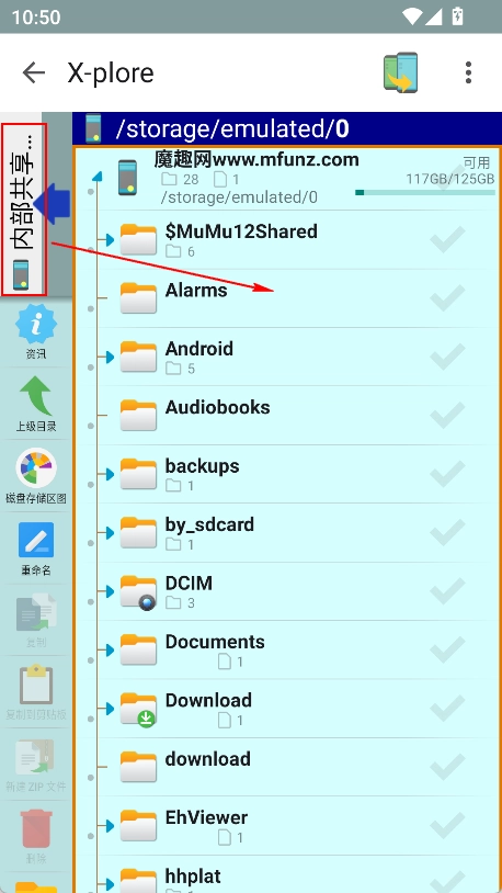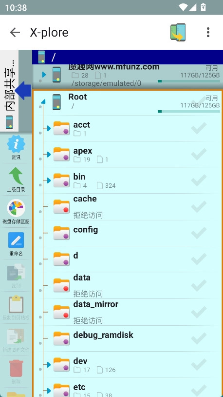 X-plore文件管理器具备查看系统文件的功能。当设备已获取Root权限且向该应用授予超级权限后,用户能够对系统数据进行修改、备份文件以及卸载应用等操作。而在未获得超级权限的情况下,用户可以通过设置隐藏内部存储器,以此避免出现误操作的情况。
