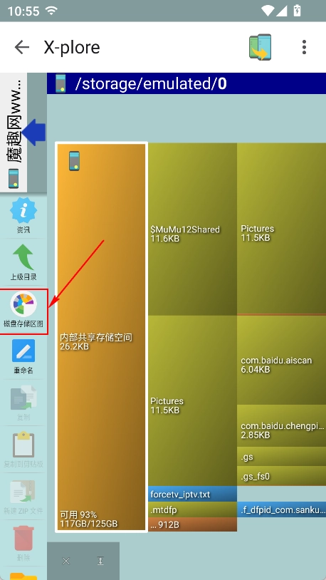 若想快速了解手机内存的占用状况,可点击磁盘存储区的图标。