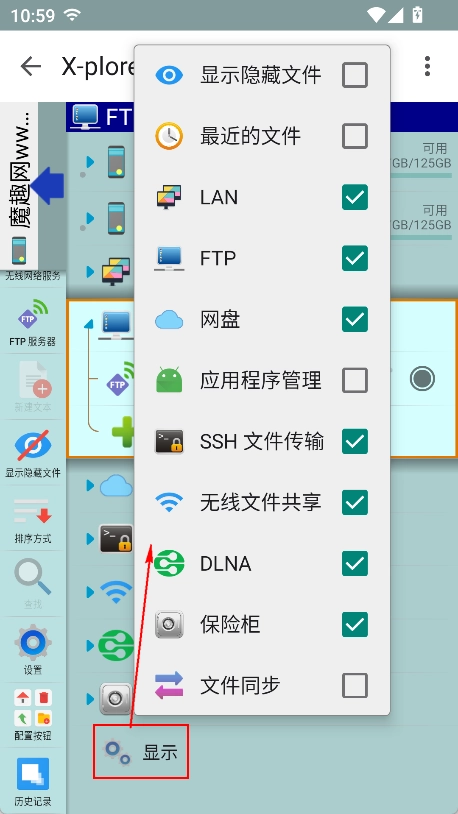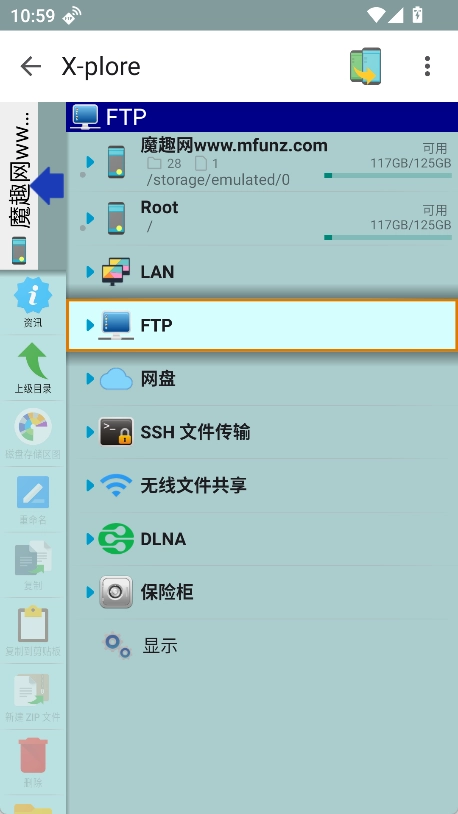 点击进入内存存储后,您会在底部看到多个功能选项,比如FTP功能和LAN功能。