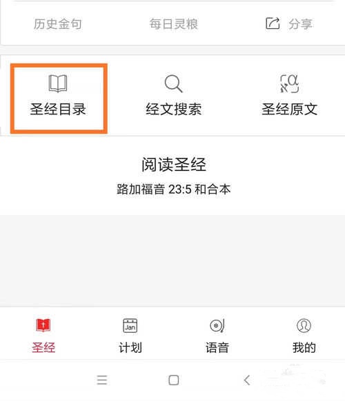 1、进入圣经经文界面后,在经文上方有一个长方框按钮,标有当前版本名称(默认是新标点和合本),点击这个按钮就进入了圣经译本界面。