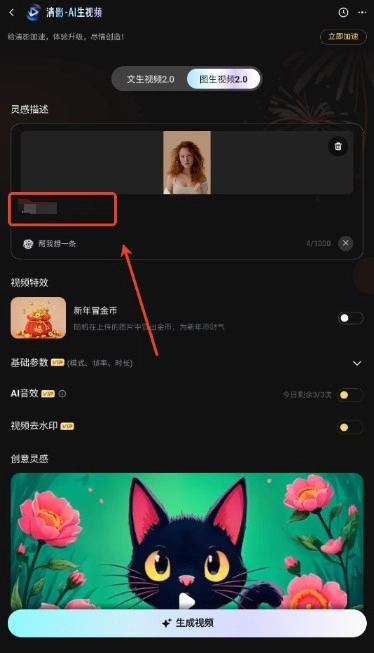 点击图生视频功能,上传图片。在此过程中,你还可以描述一下希望这张照片通过AI生成的效果。