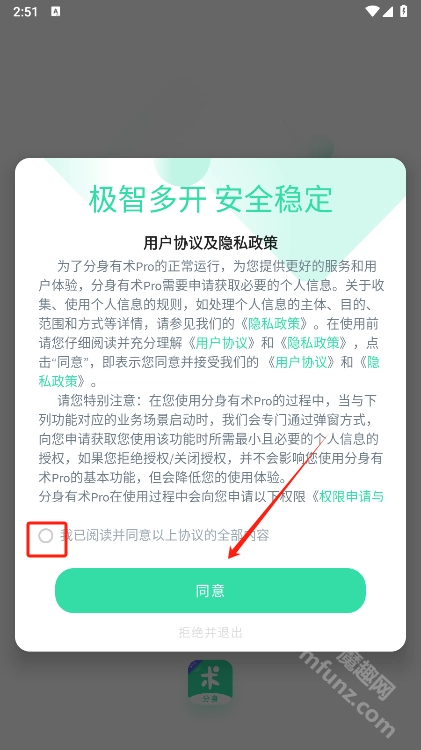 在魔趣网下载并安装分身有术Pro新版后,点击“同意”即可进入软件。