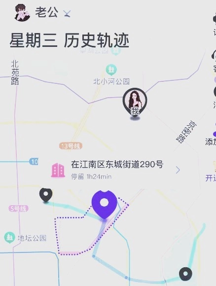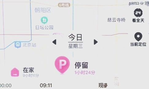 在地图界面中,用户过往的行动轨迹会被实时呈现出来。界面底部的时间模块可以自动判别用户的停留时段与移动时长,并依据这些数据完整展示全天的轨迹信息。