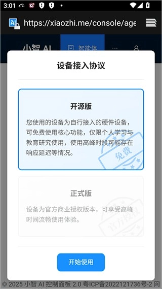 控制台显示接入协议后,选择【开源版】即可使用。