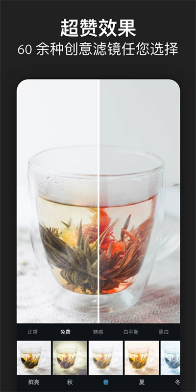 效果:拥有超45种吸睛效果!涵盖黑白、纵向、自然、双色调等多种效果类别。