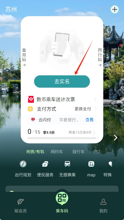 若为首次使用,需完成实名绑定操作,请点击乘车码页面上的【去实名】按钮。