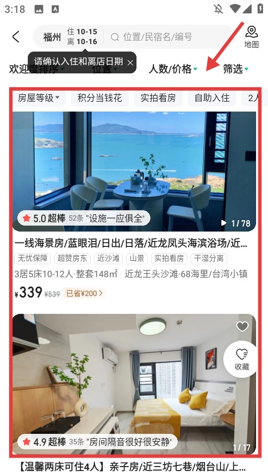 在搜索结果页面内,找到心仪的民宿房源。