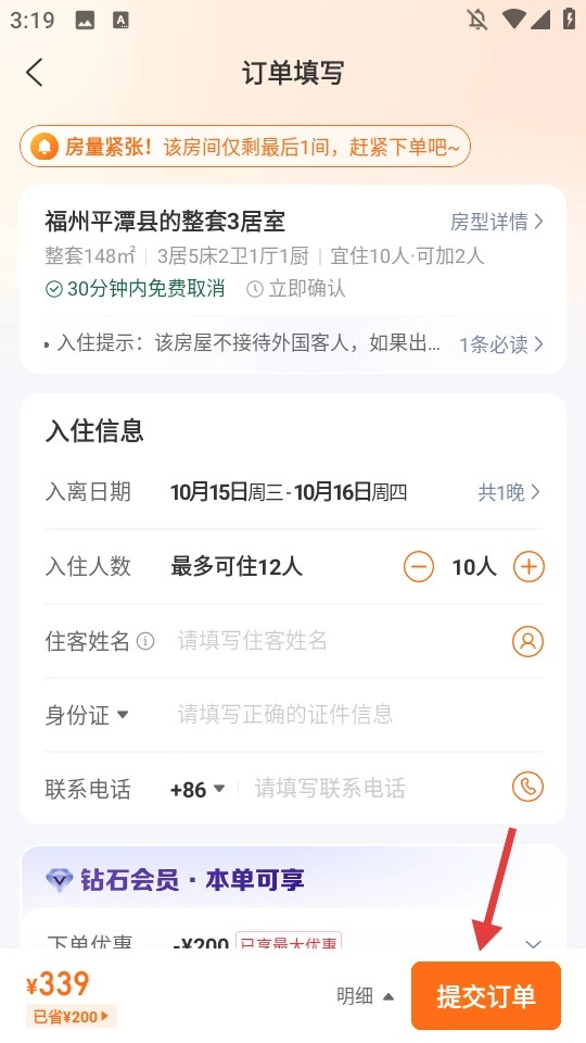 在订单填写页面,填写入住人数,以及住客的姓名、身份证号和联系电话等信息,然后点击【提交订单】按钮。