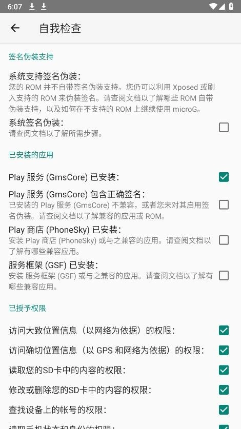 重启后首次打开microG设置,点击Self-Check时会弹出存储、电话、通讯录、定位等权限的授权提示,直接授予权限就可以了。