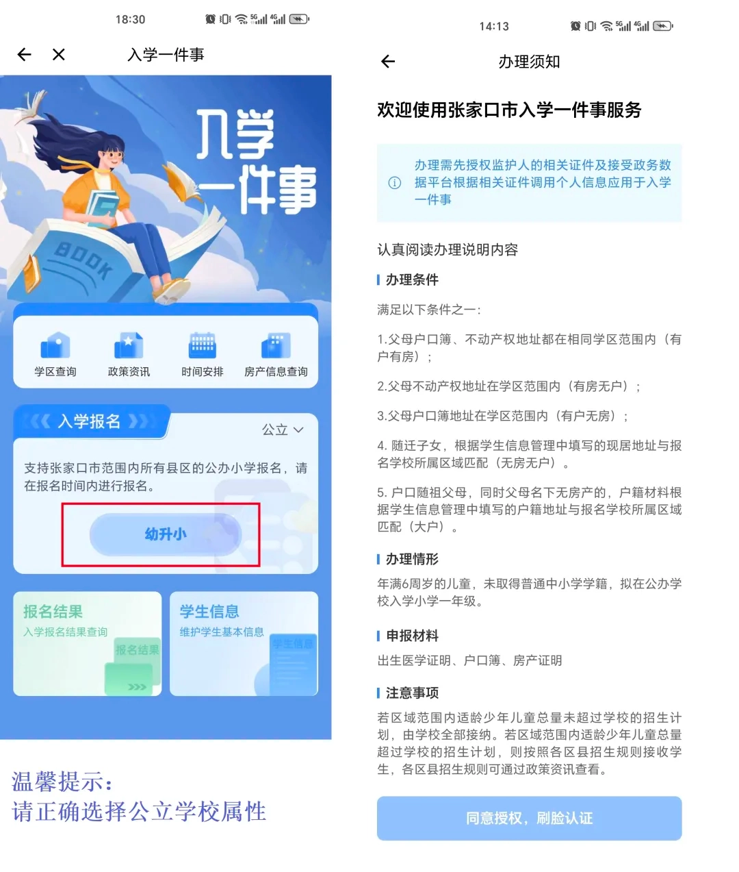 在入学报名的相关板块里,请选择“公立”类别的学校。接着点击【幼升小】这个按钮,去查看“办理须知”的内容,其中包含办理条件、申报材料、注意事项之类的信息。确认清楚之后,勾选“我已知悉并同意授权调用个人证件及信息”这一项,再点击【同意授权,刷脸认证】按钮。
