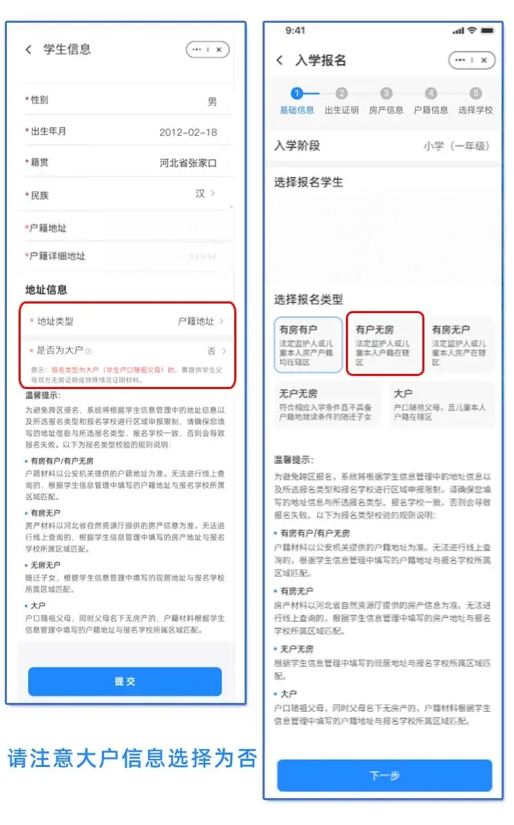 若市民属于“大户”并为学生报名,需在“是否为大户”选项中勾选“是”,系统支持在线查询学生父母的无房产信息;若无法通过在线方式查询到相关房产信息,也可在线申请开具无房证明。