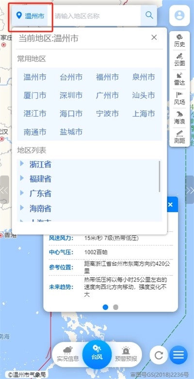 点击首页顶部的地址栏即可切换地区,进而查看各地的降雨状况和台风影响等信息。