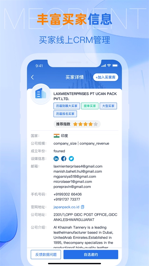 网展贸是专为外贸服务开发的办公软件,平台整合了海量买家信息,涵盖国家、公司规模、邮箱、地址及企业介绍等维度,支持便捷管理功能,助力用户高效筛选和定位目标客户。此外,软件还提供丰富商机资源,尤其适用于线下参展场景——不仅能清晰掌握到场买家名录,当目标买家抵达现场时,系统还会实时推送通知,帮助用户抢占先机。