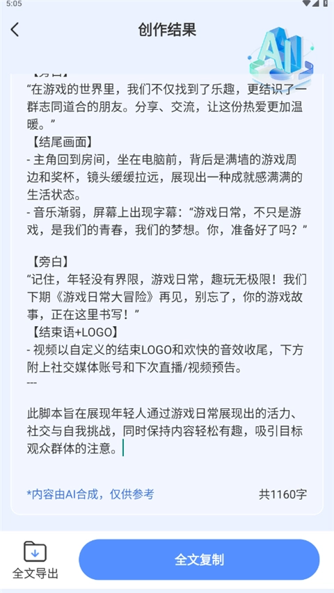 点击生成按钮后等待AI输出结果,支持对全文进行导出或复制文本的操作。