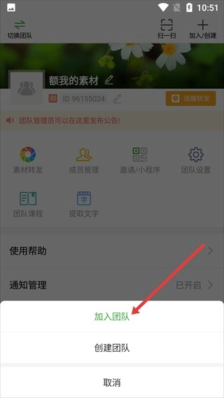 弹出的选项菜单,点击【加入团队】选项。