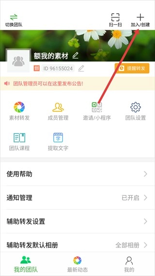 在【我的团队】展示界面,点击右上角的【加入/创建】按钮。