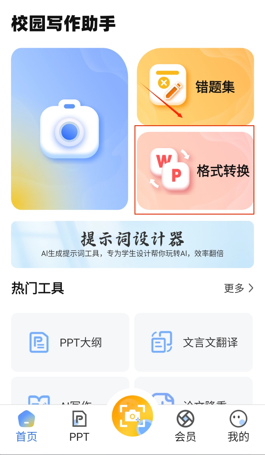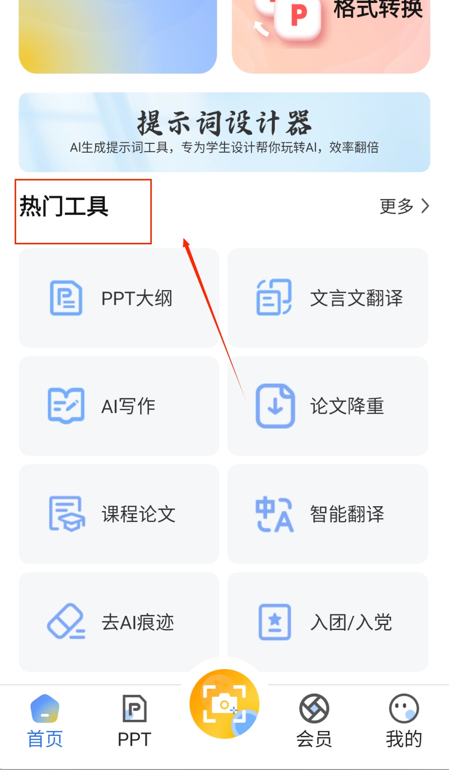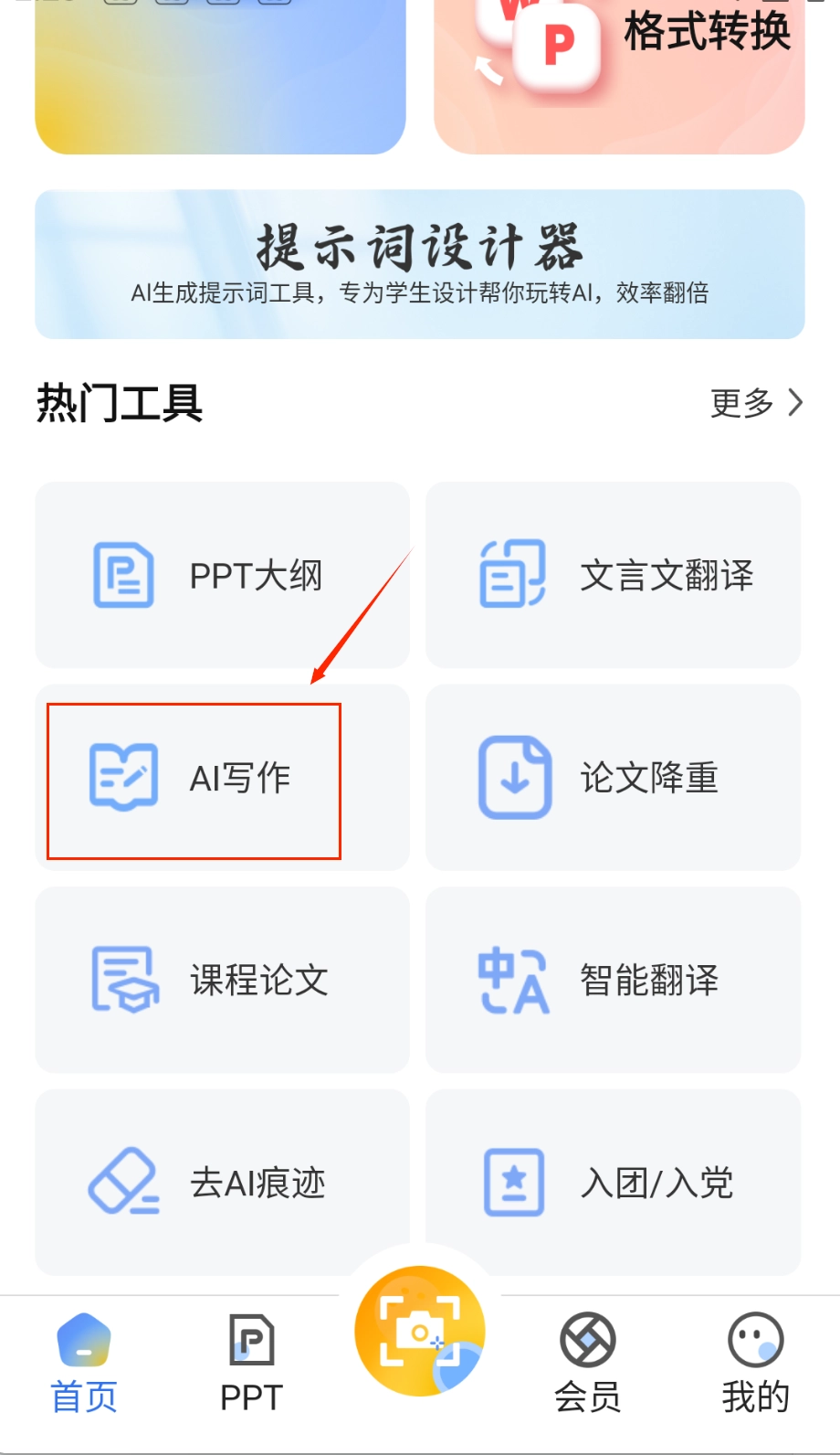 整合多种实用功能,帮助用户高效完成学习任务。通过输入关键词或上传文档可快速生成PPT,满足不同场景需求。智能写作模块能根据用户需求自动生成内容,并提供创作灵感。支持多种文档格式转换,操作简单便捷。该应用还包含提示词设计器和丰富学习工具。打开应用后,选择需要的功能模块,主界面清晰呈现PPT生成、文档转换、智能写作等核心功能区域,点击对应的图标就能进入操作页面。