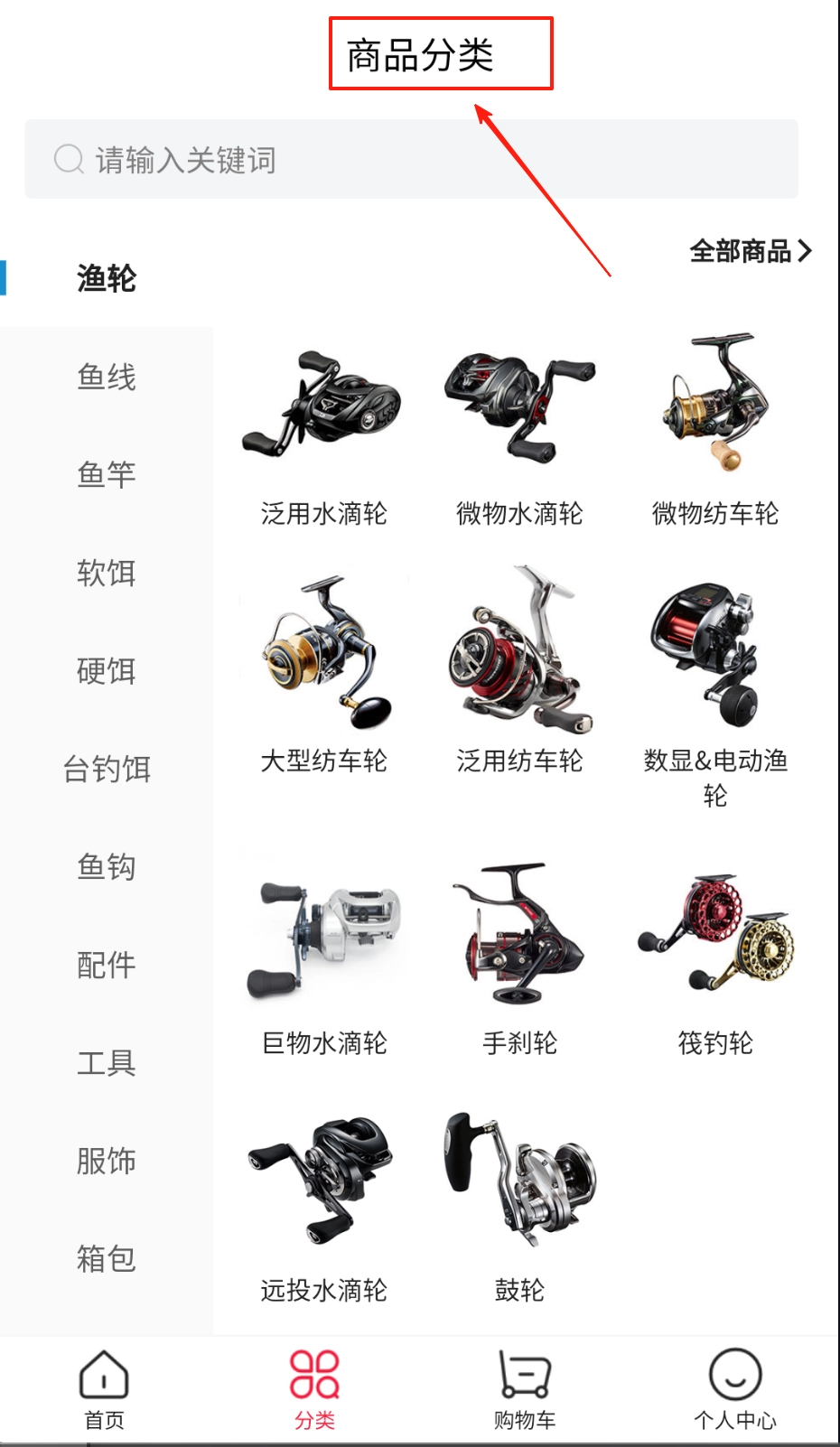 打开应用后,点击底部的导航栏,然后选择渔具分类,就能查看对应的商品列表了。