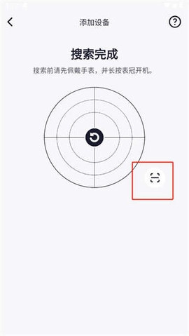 当这个页面显示出来后,就意味着搜索已经完成了。我们还可以点击右下角的【扫描】按钮,来扫描我们手表上的二维码。