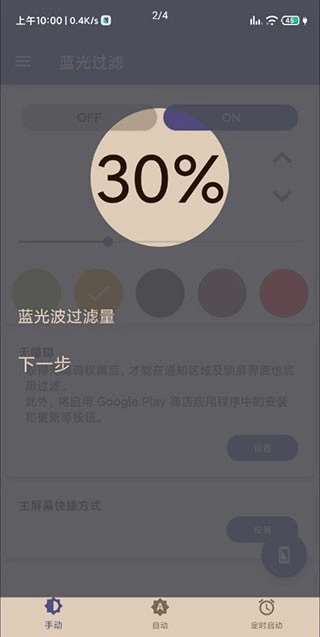当在Play Store以外的渠道安装应用时,若蓝光滤镜处于开启状态,安装按钮会无法点击,此时请通过通知栏进入蓝光滤镜的设置界面。
