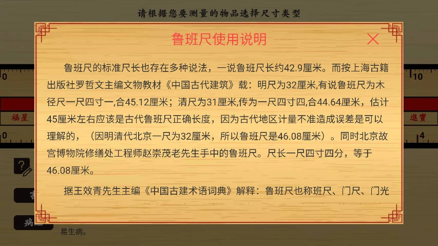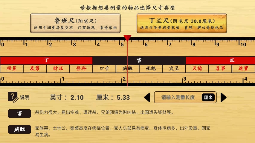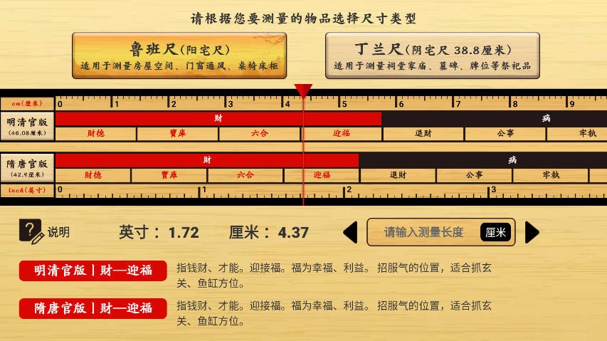 尺子选择方面,可在“鲁班尺”和“丁兰尺”之间自由切换。其中,鲁班尺也叫“文公尺”,主要用于测量房屋宅邸以及各类器具物品的尺寸;丁兰尺则更多地应用于家庙祠堂的尺寸测量。