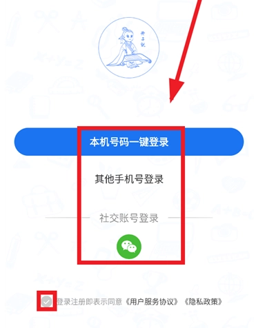 进入登录界面后,勾选登录注册即视为同意《用户服务协议》和《隐私政策》,您可以选择本机号码一键登录、其他手机号登录或微信账号登录中的任意一种方式完成登录。