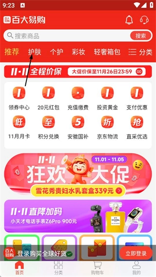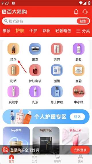 打开百大易购APP后,在首页找到“护肤”选项并点击,即可进入护肤分类页面。