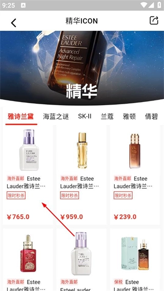 在护肤分类页面,点击精华选项,即可进入精华商品的列表页面。