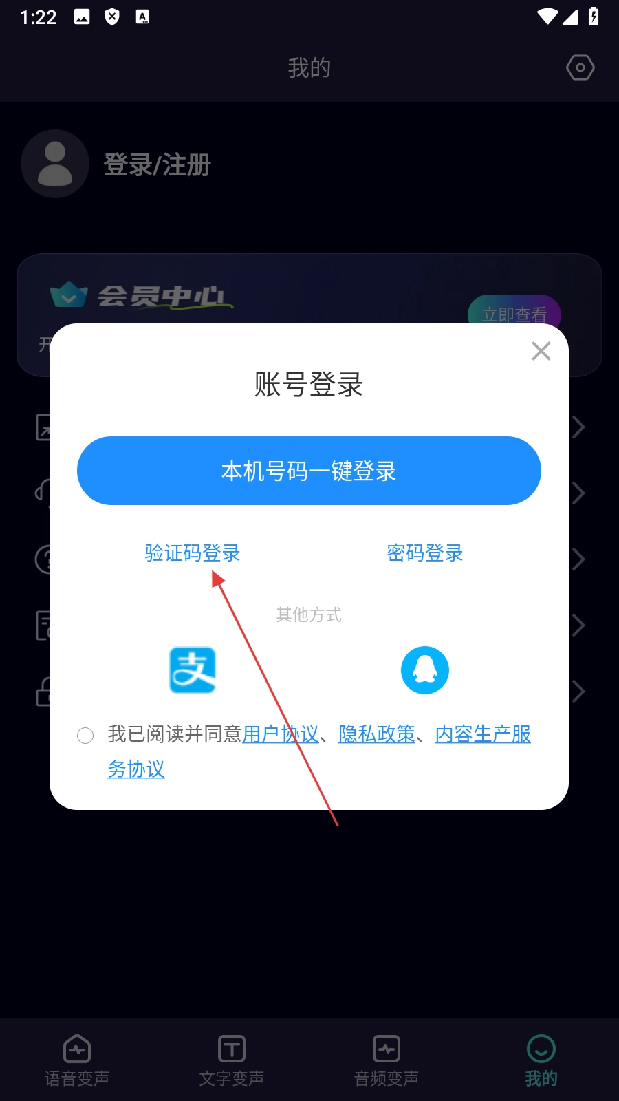 在账号登录弹窗中,点击【验证码登录】选项,即可进入验证码登录页面。