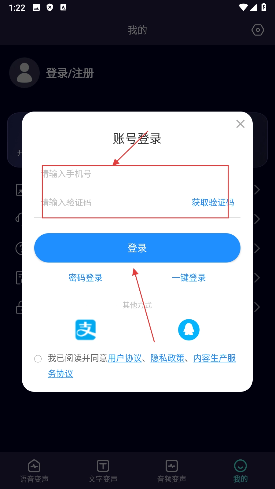 在验证码登录页面输入手机号和验证码后,点击登录按钮,就能完成账号登录的操作。